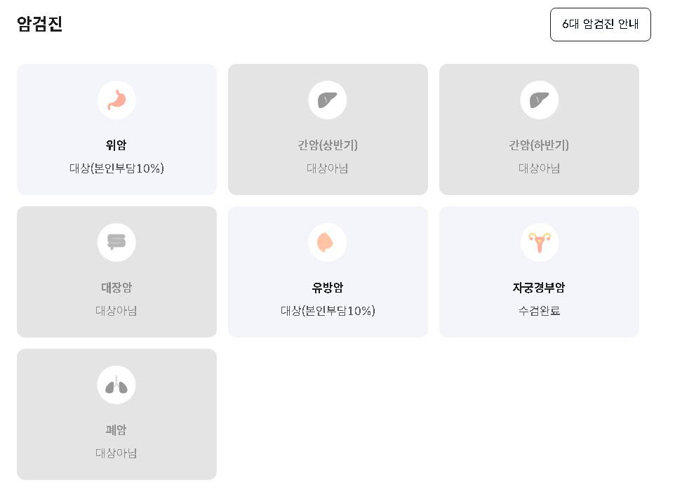- 암 검진: 위암, 대장암, 유방암, 자궁경부암, 폐암 (연령 및 성별에 따라 상이)
