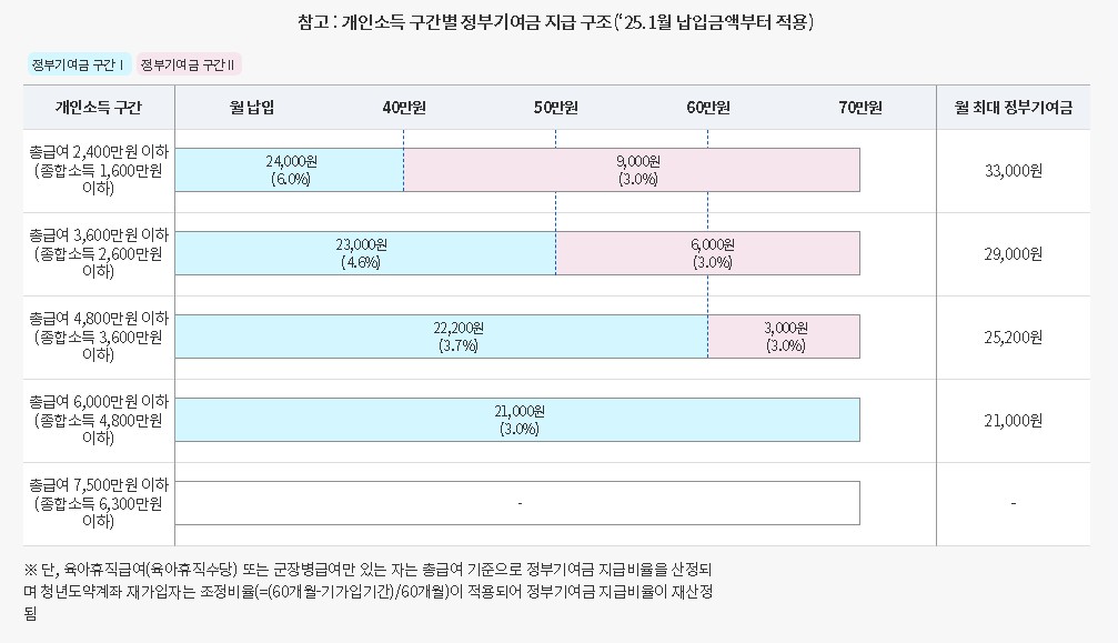 | 가구 소득 | 중위소득 180% 이하 시 정부 매칭 지원 대상 |