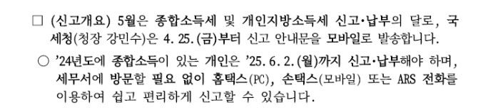 2025년 종합소득세 신고는 **5월 1일부터 5월 31일까지**입니다. 홈택스 PC 혹은 모바일 앱에서 직접 신고하거나, 세무대리인의 도움을 받을 수 있습니다.